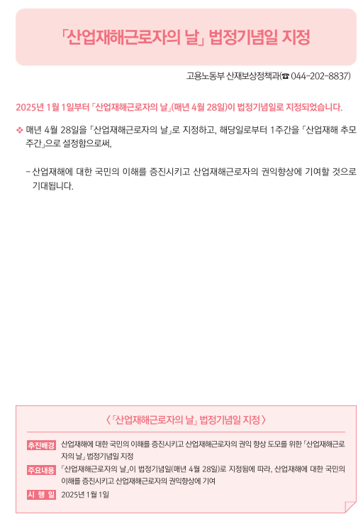 2025년 1월 1일부터 「산업재해근로자의 날」(매년 4월 28일)이 법정기념일로 지정되었습니다.