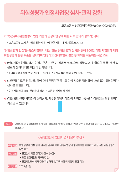 2025년부터 위험성평가 인정 기준과 인정사업장 사후 관리가 강화됩니다.