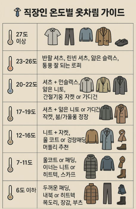 💡 TIP: 아침 기온보다 낮보다 5도 낮은 경우가 많으니, 출근 시간대 기준으로 옷차림을 고르는 것이 가장 좋습니다!
