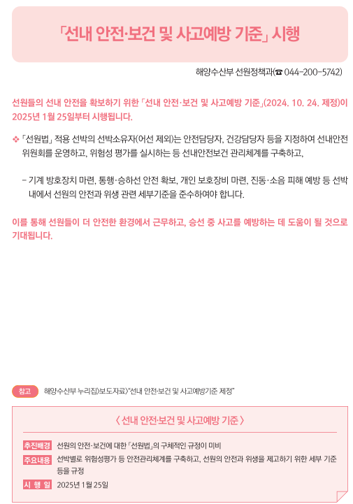 자세한 사항은 해양수산부 누리집 > 보도자료 > 「선내 안전·보건 및 사고예방 기준」 제정에서 확인 가능합니다.