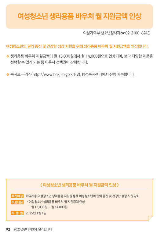- 생리용품 바우처 지원금액이 월 13,000원 → 월 14,000원으로 인상