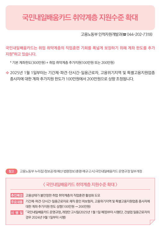 고용노동부 인적자원개발과는 2025년 1월 1일부터 국민내일배움카드의 취약계층 지원수준을 확대한다고 발표했습니다.