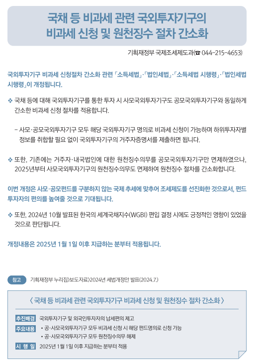 2025년 1월 1일부터 국채 등 비과세와 관련한 국외투자기구의 비과세 신청 및 원천징수 절차가 간소화됩니다.