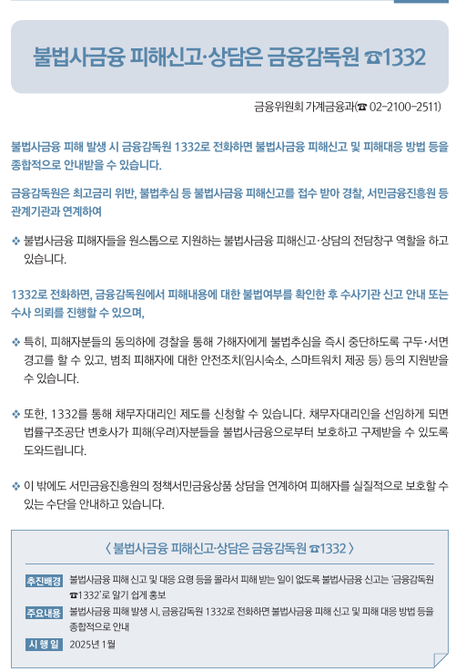 불법사금융으로 인한 피해를 예방하고 구제받기 위해서는 금융감독원 1332를 적극 활용하시기 바랍니다.