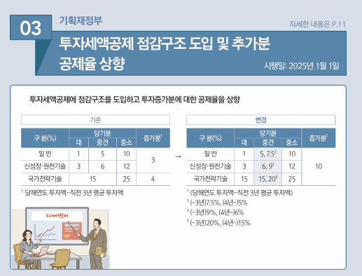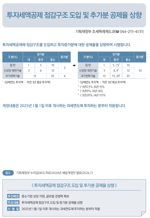 2025년 1월 1일부터 투자세액공제에 점감구조가 도입되고, 투자 증가분에 대한 공제율이 상향됩니다.