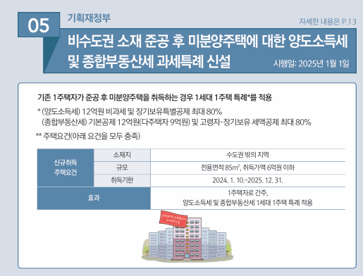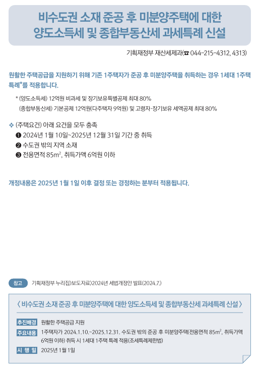 2025년 1월 1일부터 비수도권 소재 준공 후 미분양주택에 대해 양도소득세 및 종합부동산세 과세특례 제도가 신설됩니다.
