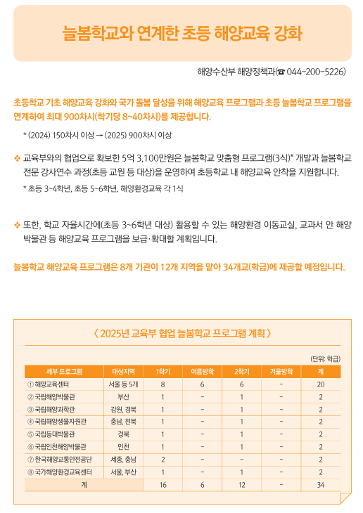 해양수산부 해양정책과는 초등학교 기초 해양교육 강화를 위해 해양교육 프로그램을 늘봄학교 프로그램과 연계하여 최대 900차시(학기당 8~40차시) 제공한다고 발표했습니다.