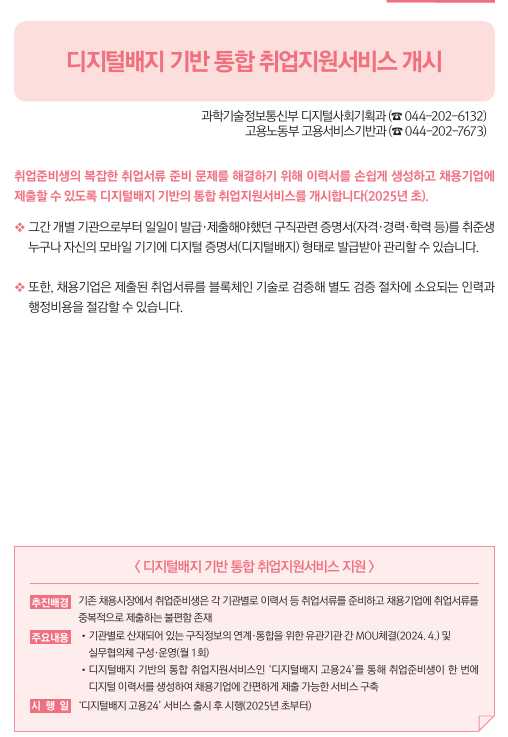 과학기술정보통신부와 고용노동부는 취업준비생이 손쉽게 취업서류를 생성하고 제출할 수 있도록 디지털배지 기반 통합 취업지원서비스를 2025년 초에 개시한다고 발표했습니다.