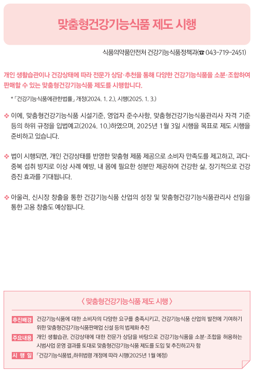 맞춤형건강기능식품 제도가 2025년 1월 3일부터 시행됩니다.