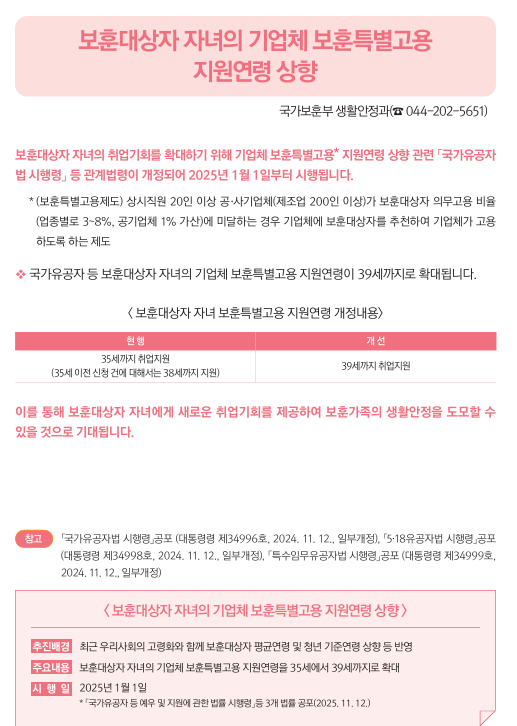 • 보훈특별고용제도 개편: 보훈특별고용 지원 연령이 35세 → 39세로 상향 조정