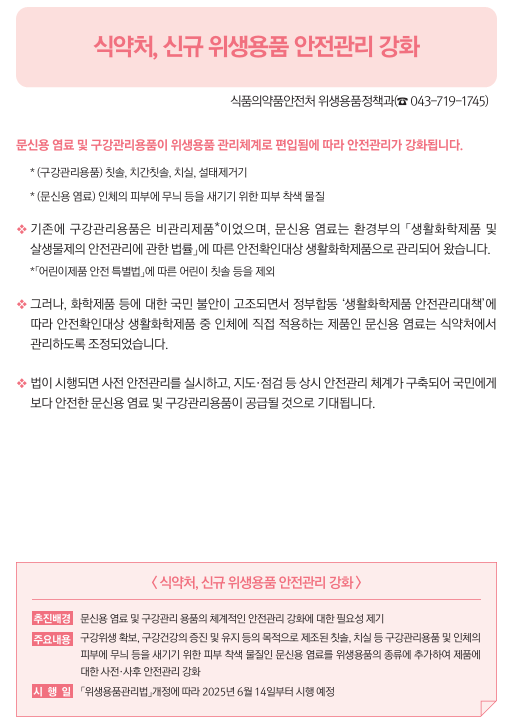 문신용 염료 및 구강관리용품이 위생용품 관리체계로 편입됨에 따라 안전관리가 강화됩니다.
