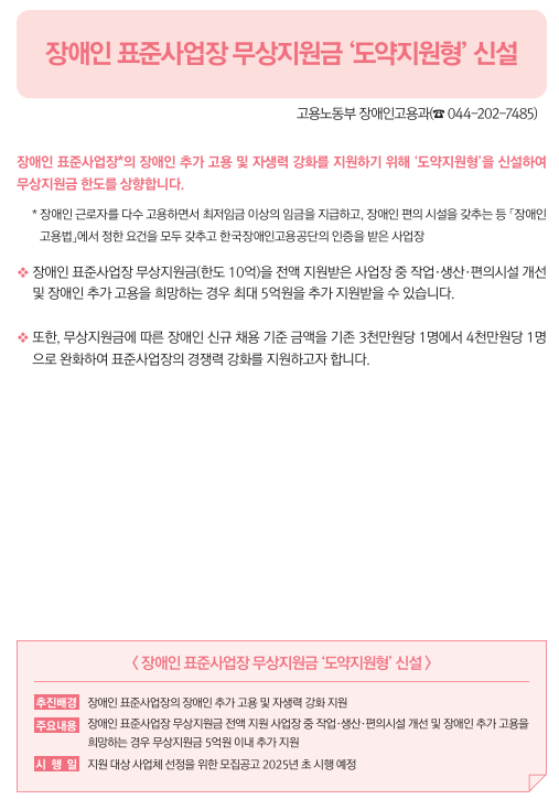 고용노동부 장애인고용과는 2025년 초부터 장애인 표준사업장의 추가 고용과 자생력 강화를 위한 ‘도약지원형’ 무상지원금을 신설한다고 발표했습니다.