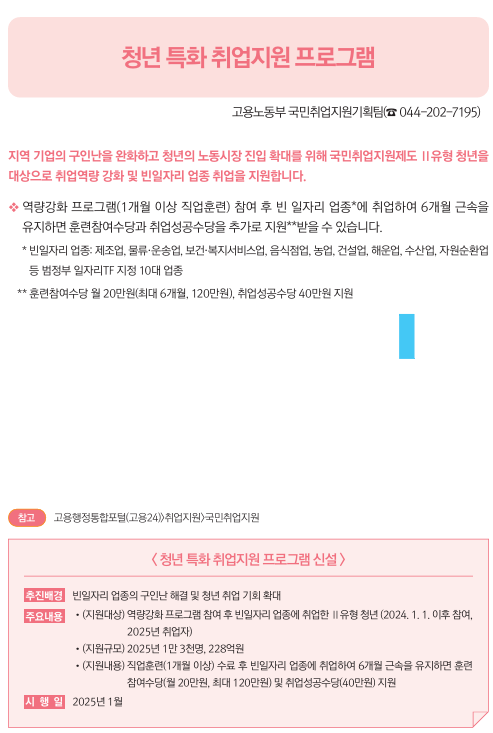 - 역량강화 프로그램 (1개월 이상 직업훈련) 참여 후 빈 일자리 업종 취업 시 6개월 근속 유지 조건으로 추가 지원