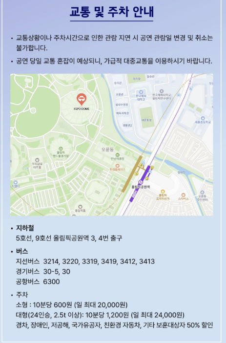 공연 당일 혼잡 예상. 가급적 대중교통 이용 권장.